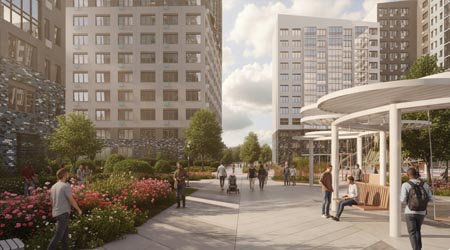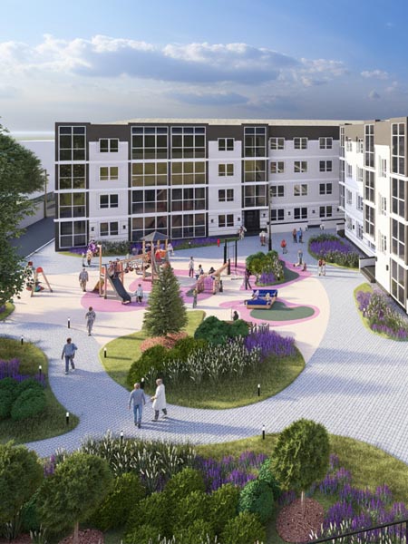 Планировочная структура комплекса продумана до мелочей: от пешеходных маршрутов и зон отдыха до размещения детских площадок и зелёных уголков.